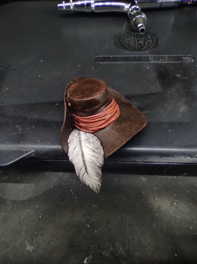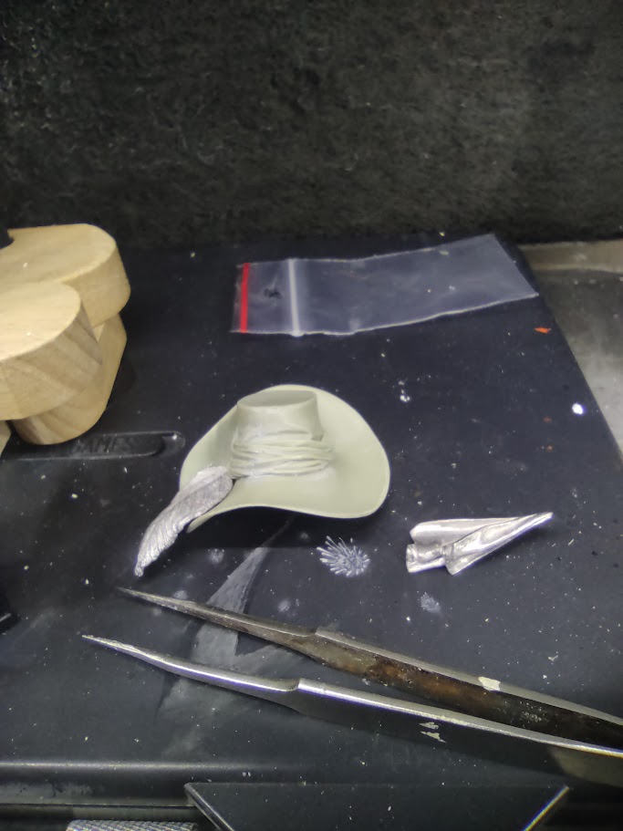 J'ai ensuite commencé à travailler sur le chapeau et la plume. Pour le chapeau j'aimerai un cuir mais très usé et buriné, un cuir qui a souffert de l'eau de mer, donc là ce n'est qu'un début. Pour la plume, j'imagine une plume d'autruche, Madagascar n'étant pas trop éloigné de l'Affrique il a pu y faire escale et s'en procurer une mais naturelle, sans teinture. Pareil on n'en est qu'au début, mais je vérifie l'ensemble