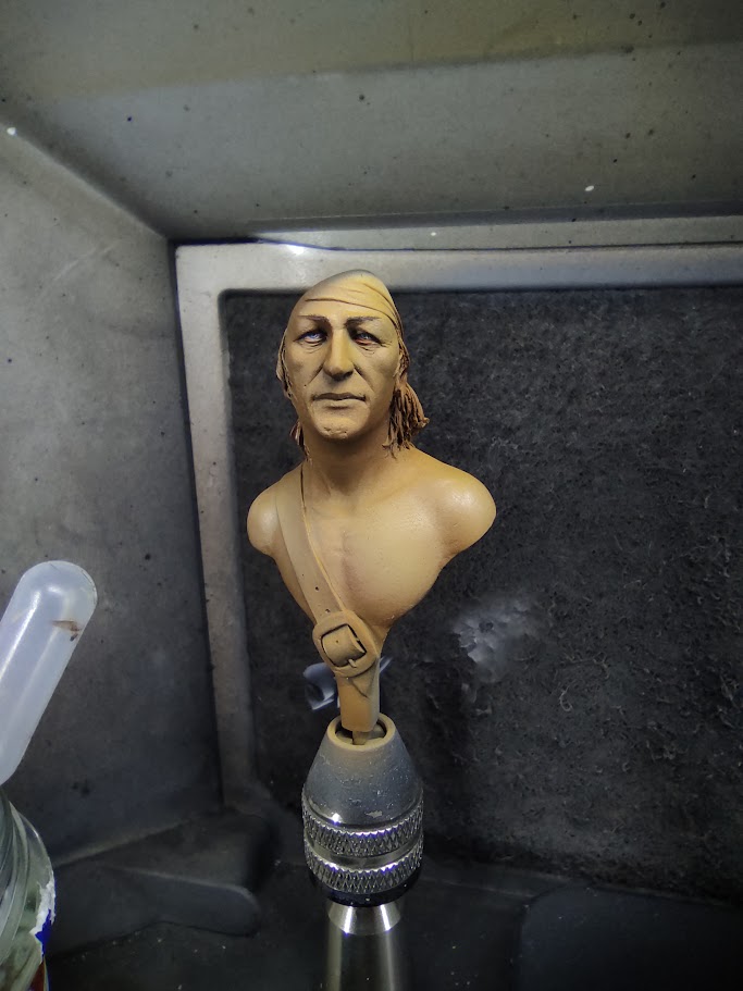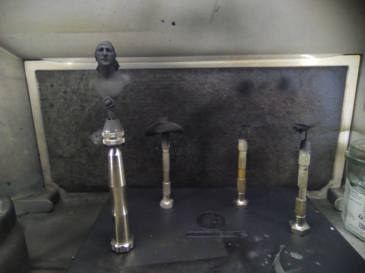 Puisque j'ai la station de travail en config aéro, je décide de faire les bases de la chair avec cette méthode. Je change juste d'outil puisque cette fois je vais travailler avec un de mes Iwata. Pour les sous couches j'utilise des aéro bas de gamme... J'emploi pour les bases des peinture prince august, que je dilue beaucoup, même pour celle de la gamme aéro